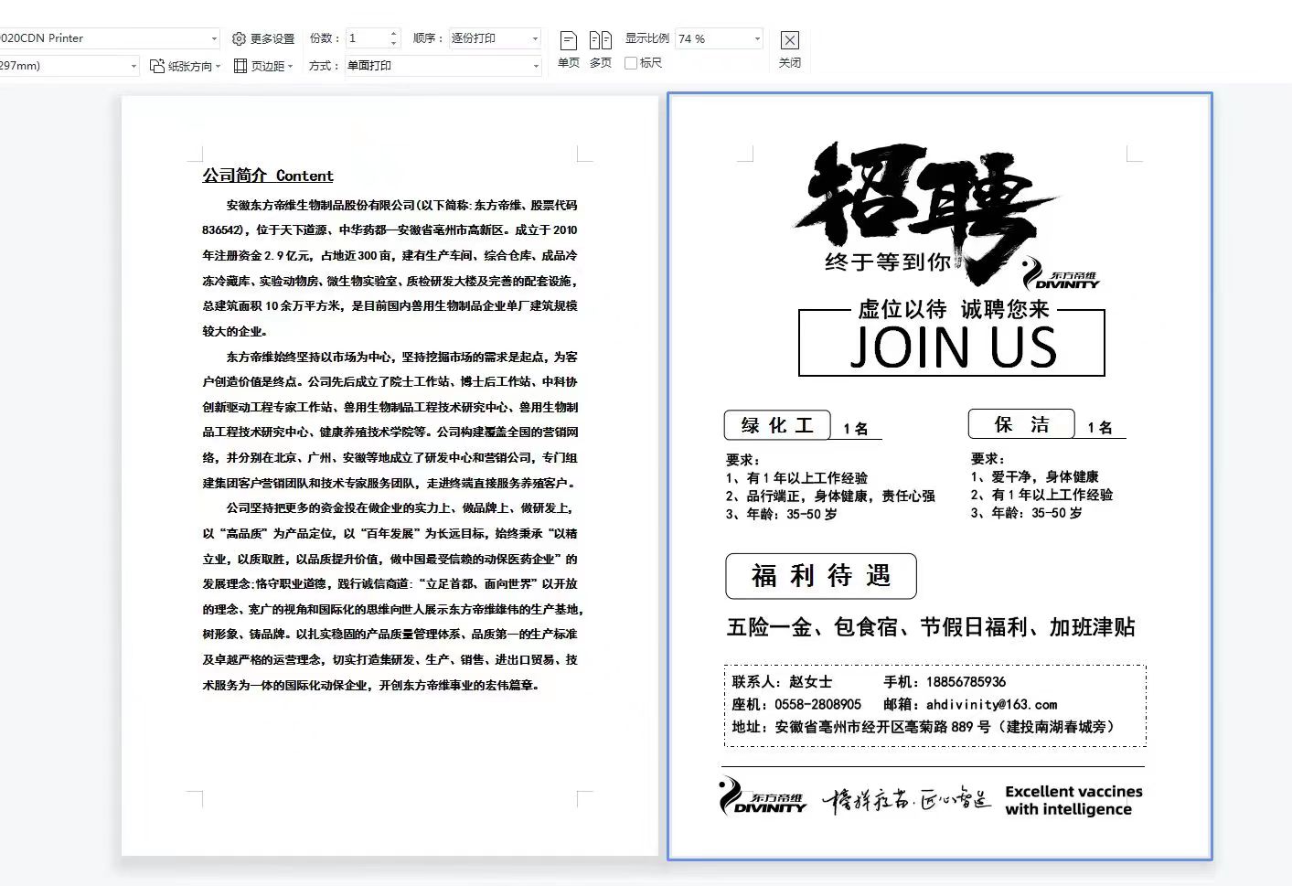 東方帝維生物制品招聘綠化工、保潔